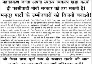 ज़रा सोचिये दोस्तो! मोदी सरकार के झूठे प्रचार में मत फँसिये। यह “मज़बूत सरकार” नहीं बल्कि पूँजीपतियों के सामने नतमस्तक और बिकी हुई सरकार है। इसे सत्ता से हटाए बिना मज़दूर वर्ग की बरबादी होगी। फासीवादी भाजपा को हराना, मज़दूर वर्ग का सबसे अहम तात्कालिक लक्ष्य है। यह भी तभी सम्भव है जबकि मज़दूरों-मेहनतकशों की स्वतन्त्र आवाज़ संसद तक पहुँचे। RWPI इसी मक़सद के साथ चुनावों में हस्तक्षेप कर रही है और हमें इसे जिताना होगा।